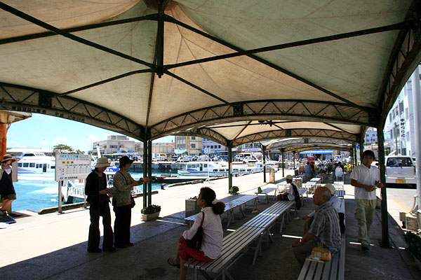 昼下がりの離島桟橋はそれなりに賑わっています。買い物帰りやこれからリゾートに行く人などさまざま。