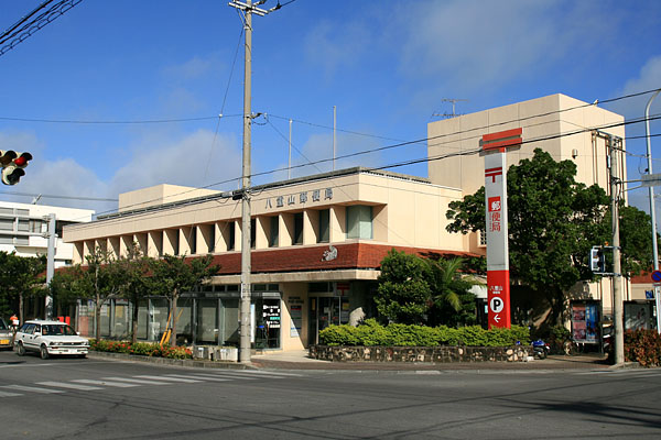 あや乃荘から離島桟橋に向かう途中にある八重山郵便局。郵便局の集配業務合理化により、日本最西端の与那国郵便局や日本最南端の波照間郵便局の集配業務もこの郵便局が受け持つことになる。1日1往復の航空便しかない与那国島から午後に出した島内宛の郵便物は翌日の航空機で石垣に運び、その翌日再び与那国戻るとなると、隣の家宛の郵便が2日後にならないと届かないということになる。この辺は改善されるとは思うが・・・。 |